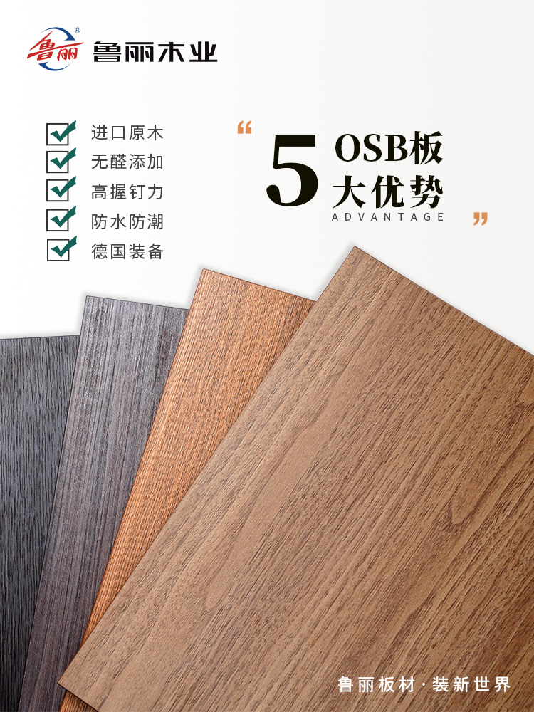 产品特点:★精选鲁丽OSB优质基材,理化性能卓越; ★ENF级,绿色无醛,健康环保 ★防水防潮,适用于各种环境 ★先进压贴设备,质量保障 ★优选饰面纸,时尚环保,满足不同设计需求 ★应用表现优于其他板种,不变形,可取消拉直器